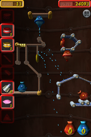 そして水滴を入れるために画面左側に並べてある道具を画面上に自由に配置(角度なども変更可)して水滴の流れをコントロールしてもう一方の壷へ導くのです。